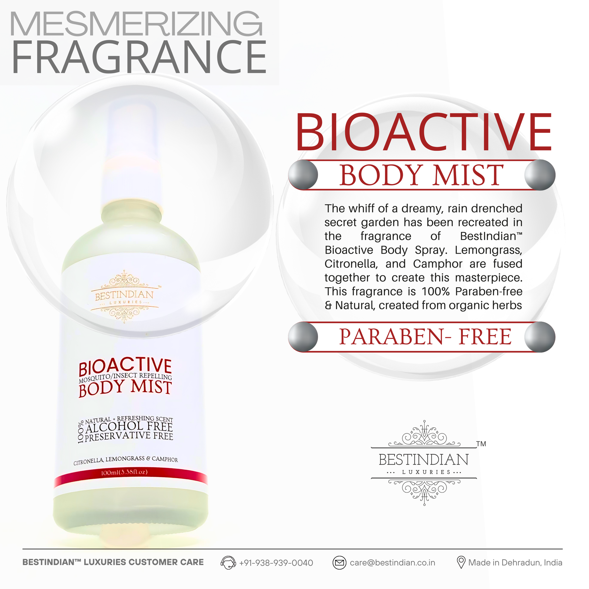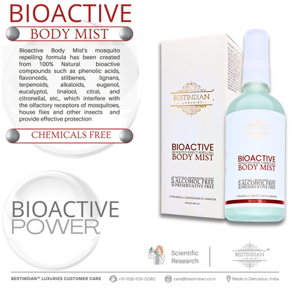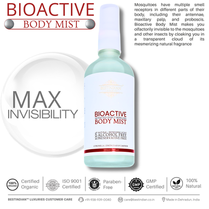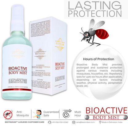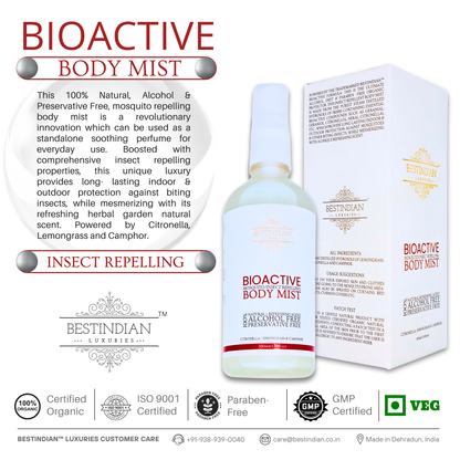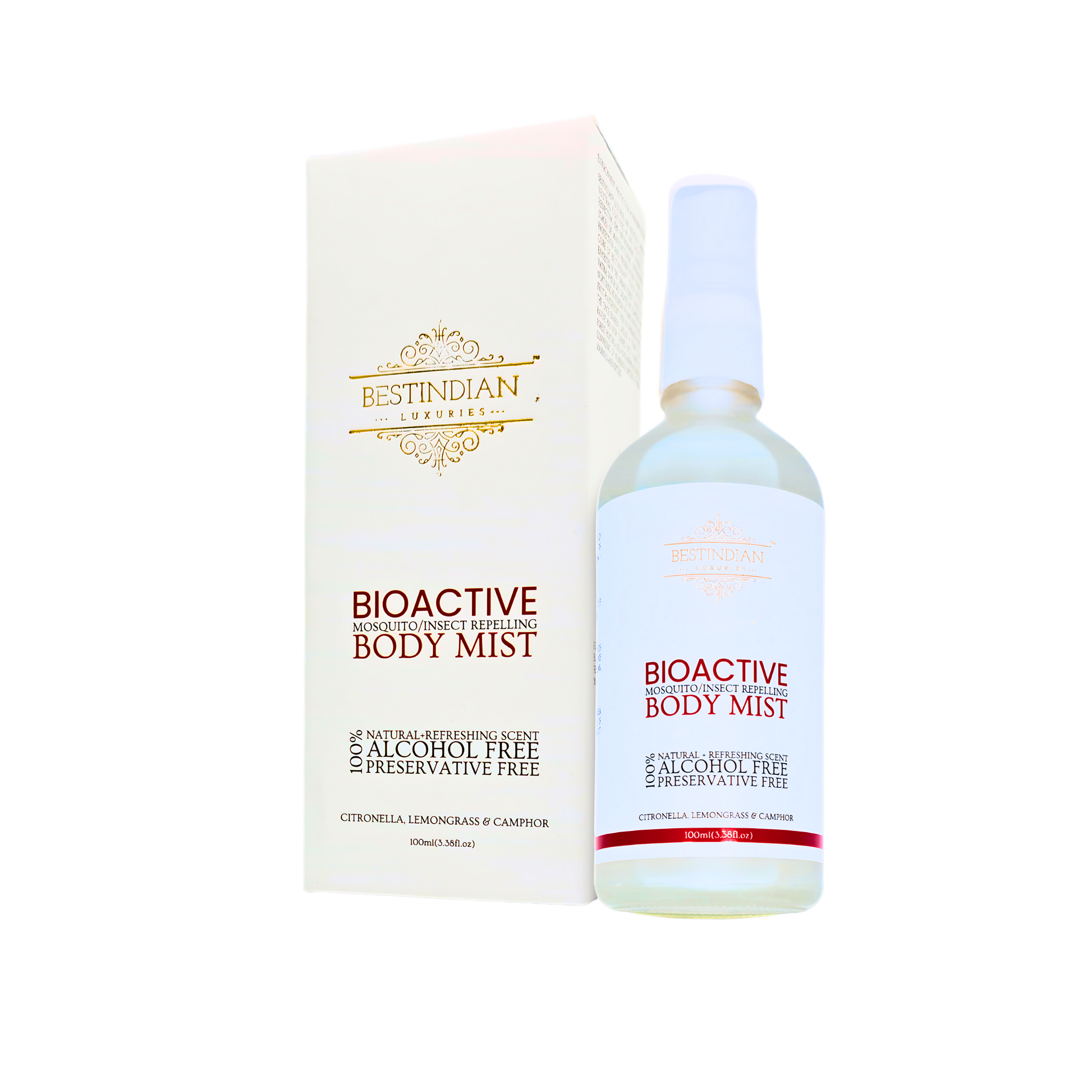 BestIndian™ BioActive Body Mist is a luxurious natural mosquito repellent, made with Citronella, Lemongrass, and Camphor for safe, herbal protection.