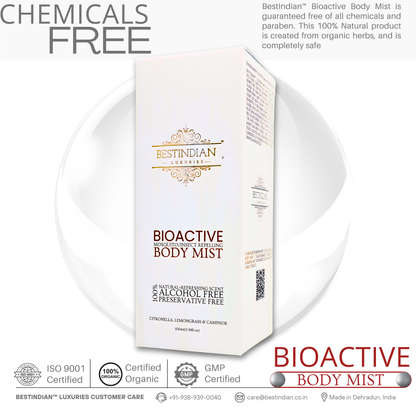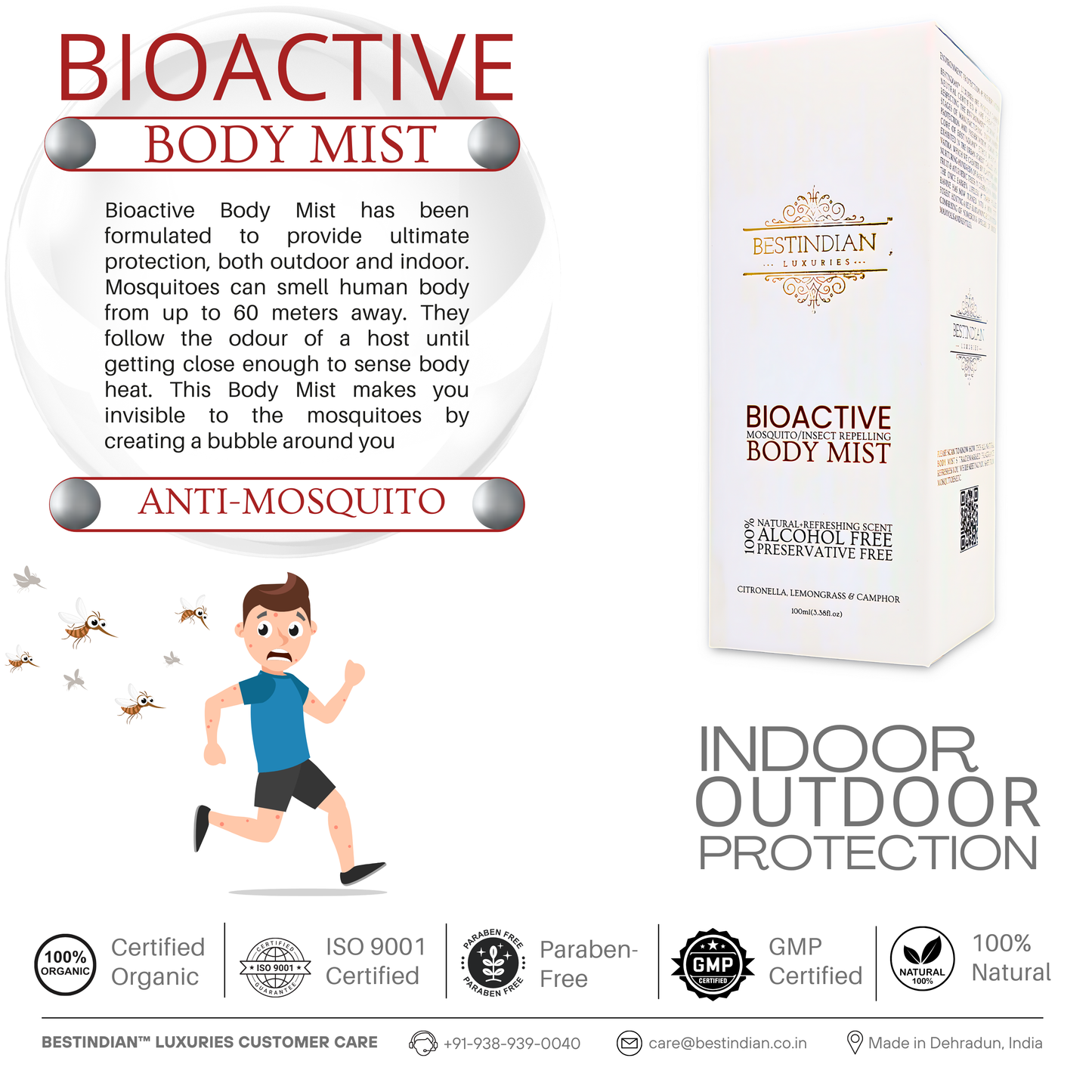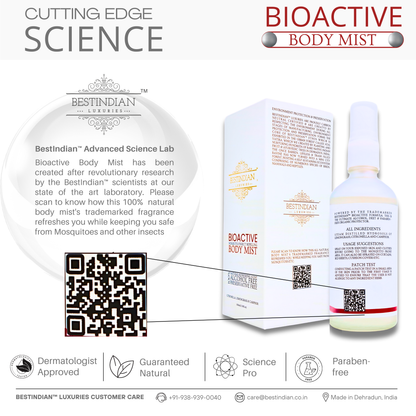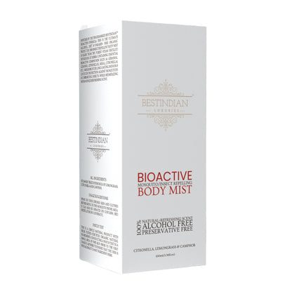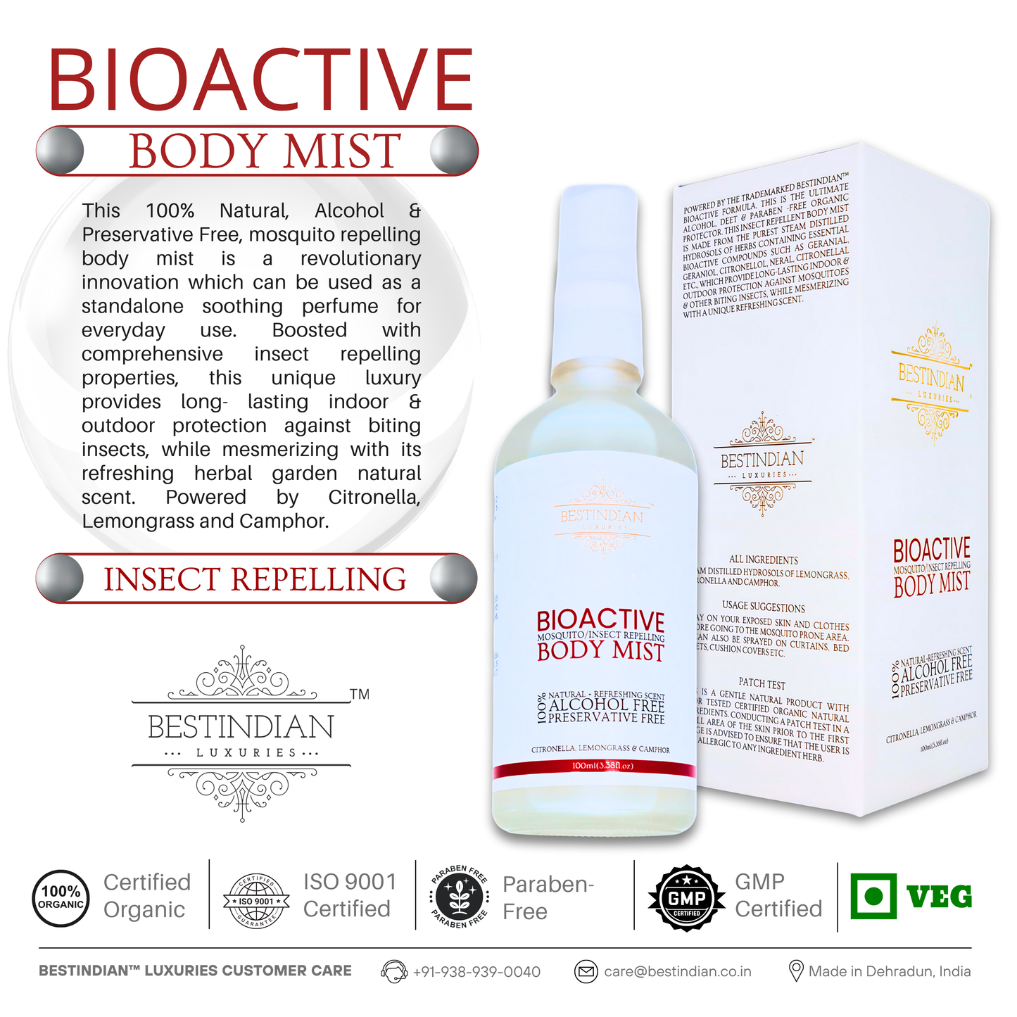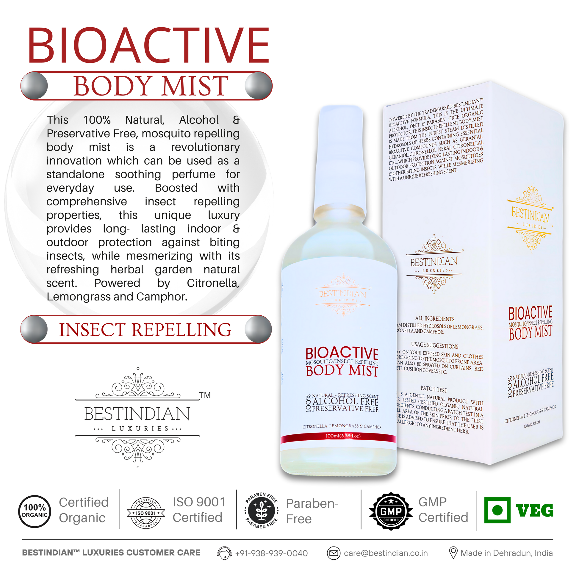 BestIndian™ BioActive Body Mist is a luxurious natural mosquito repellent, made with Citronella, Lemongrass, and Camphor for safe, herbal protection.