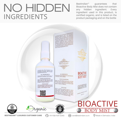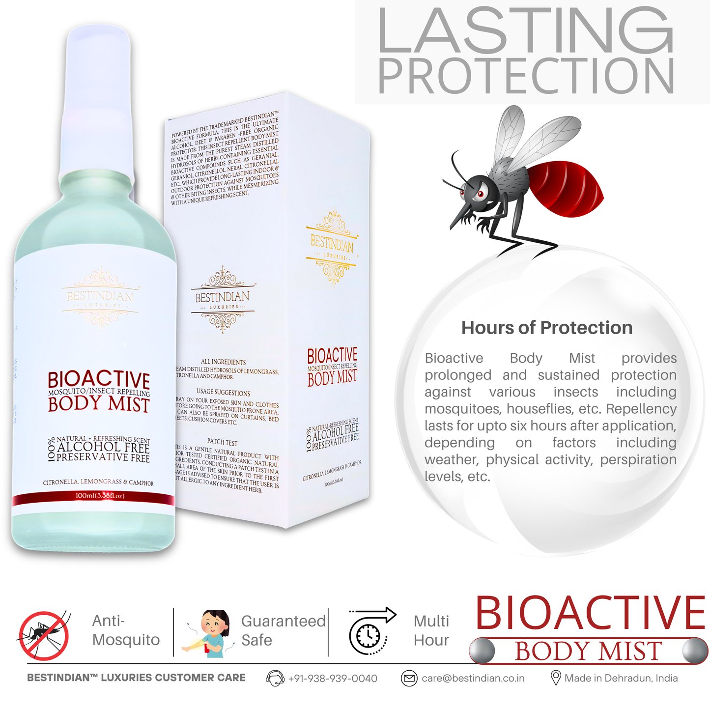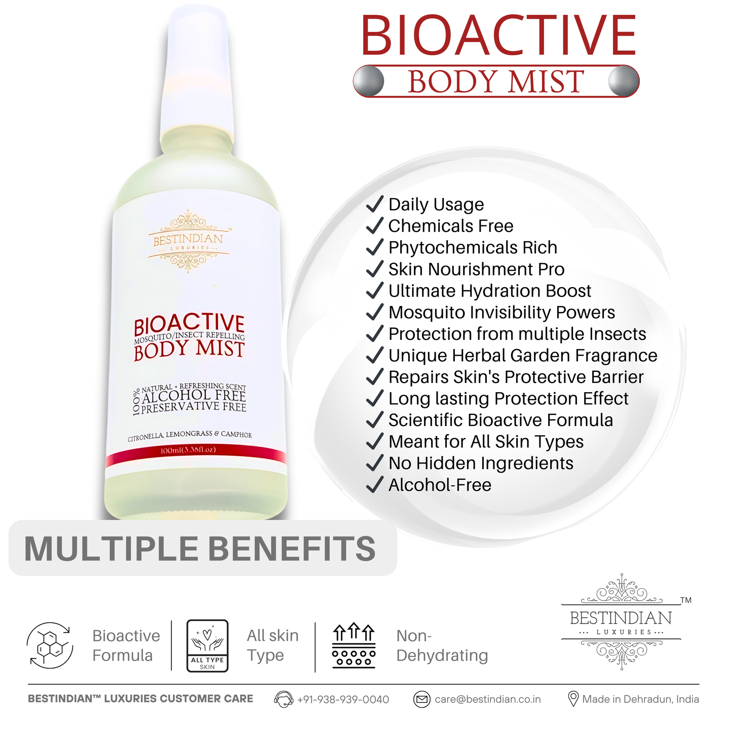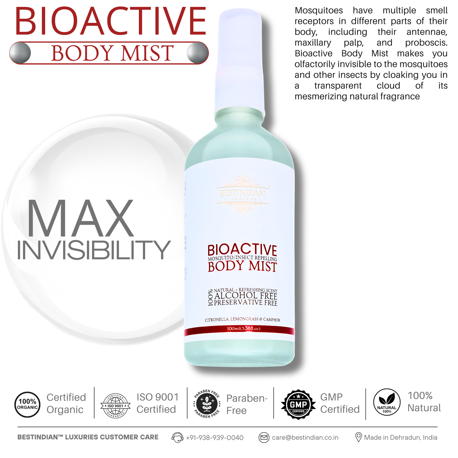 Unlike conventional sprays that rely on synthetic chemicals like DEET, the BioActive Body Mist is a natural insect repellent that is 100% alcohol-free, preservative-free, and herbal. It uses the power of Ayurvedic botanicals to create its effect, all while delivering a subtle, luxurious fragrance.